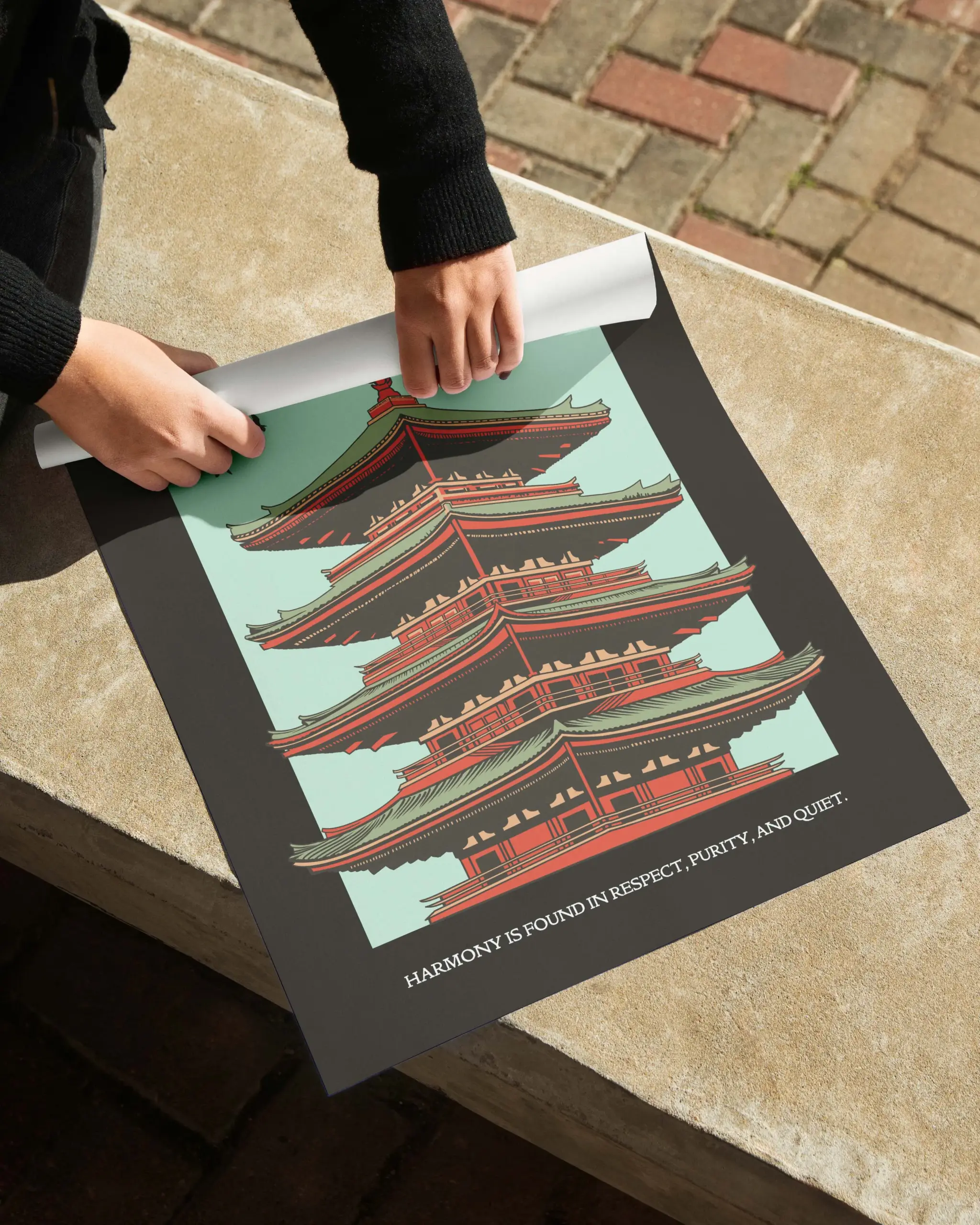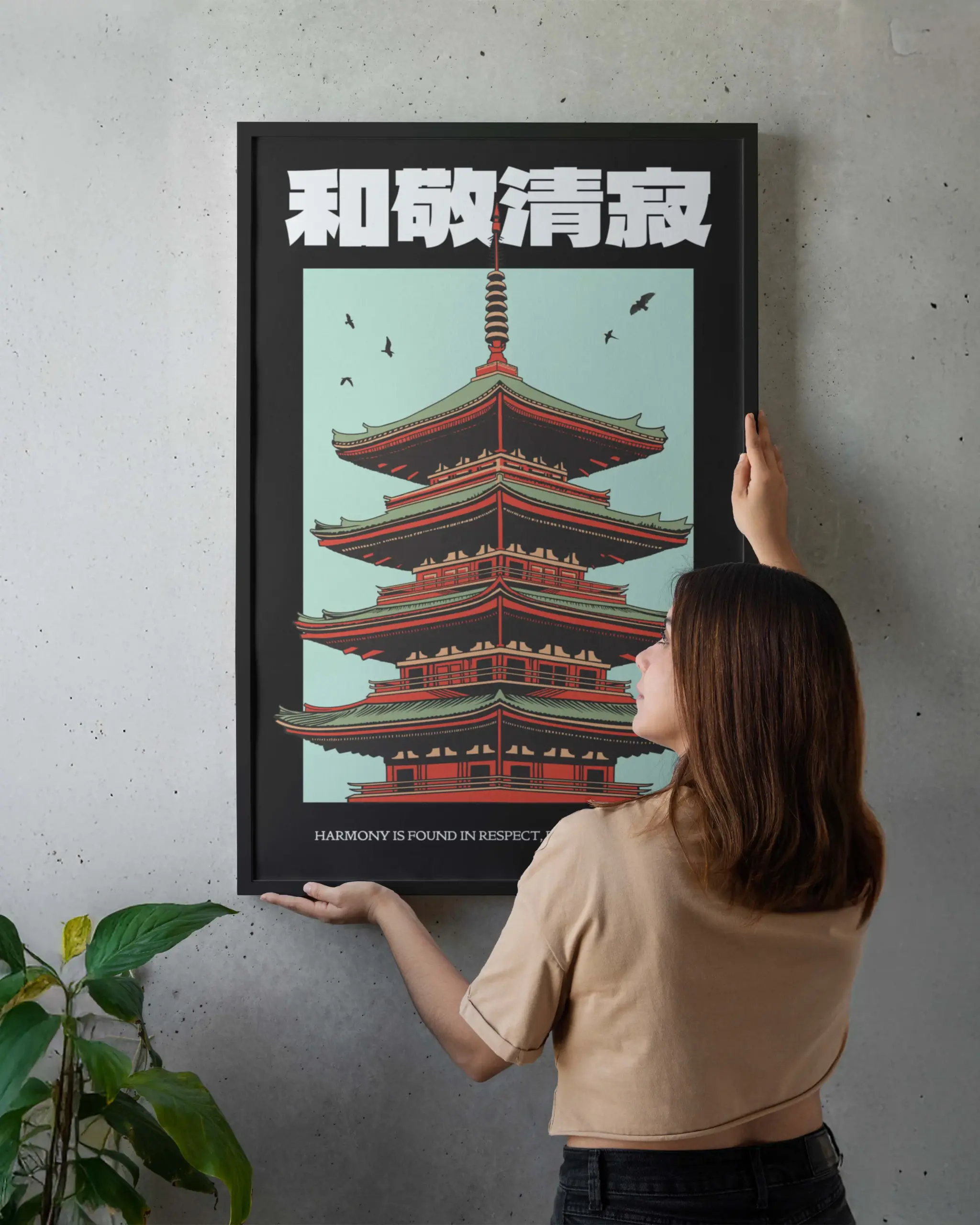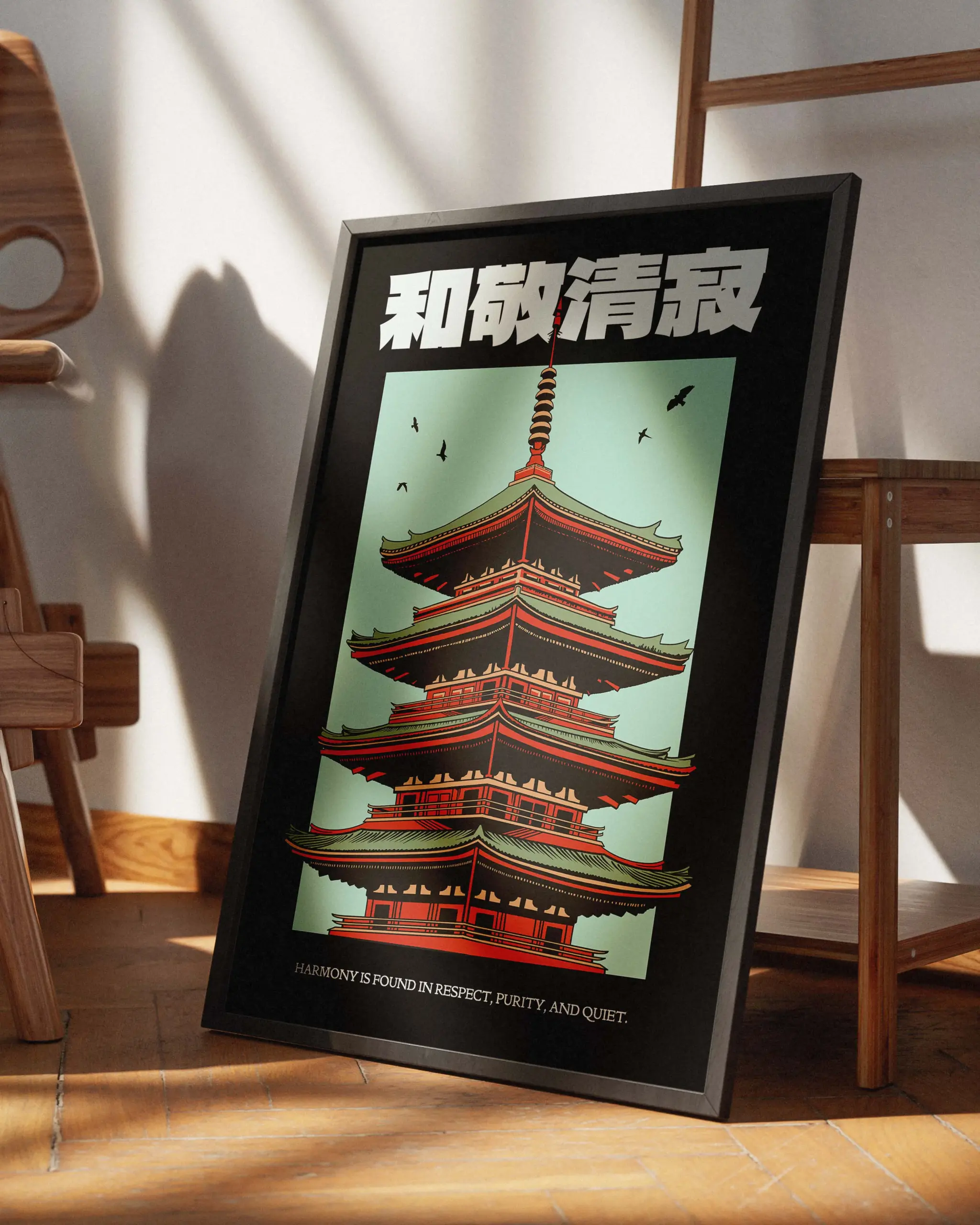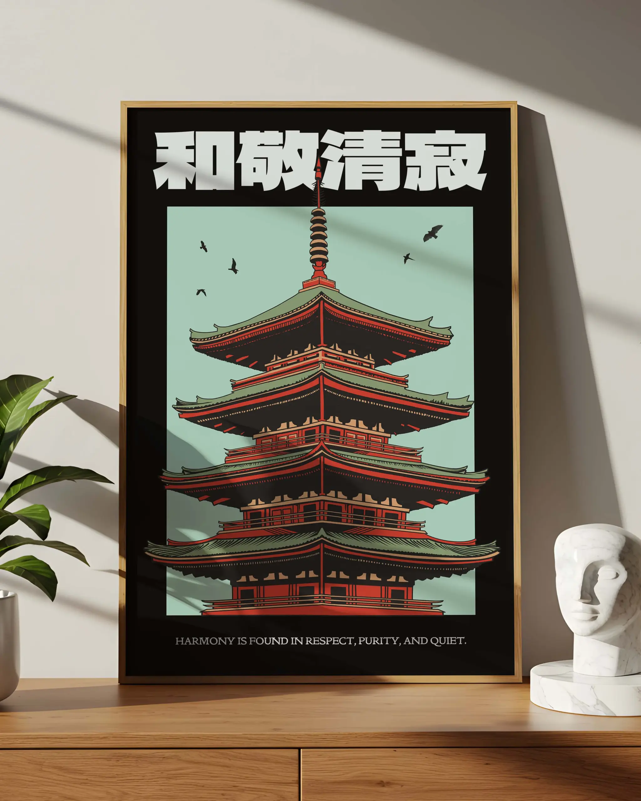 This Wa–Kei–Sei–Jaku poster features a striking Japanese temple rendered in bold, balanced symmetry, symbolizing harmony, respect, purity, and tranquility. Inspired by Zen philosophy and traditional Japanese architecture, the design blends calm tones with strong structure, creating a timeless artwork that brings mindfulness, cultural depth, and quiet elegance to any space.