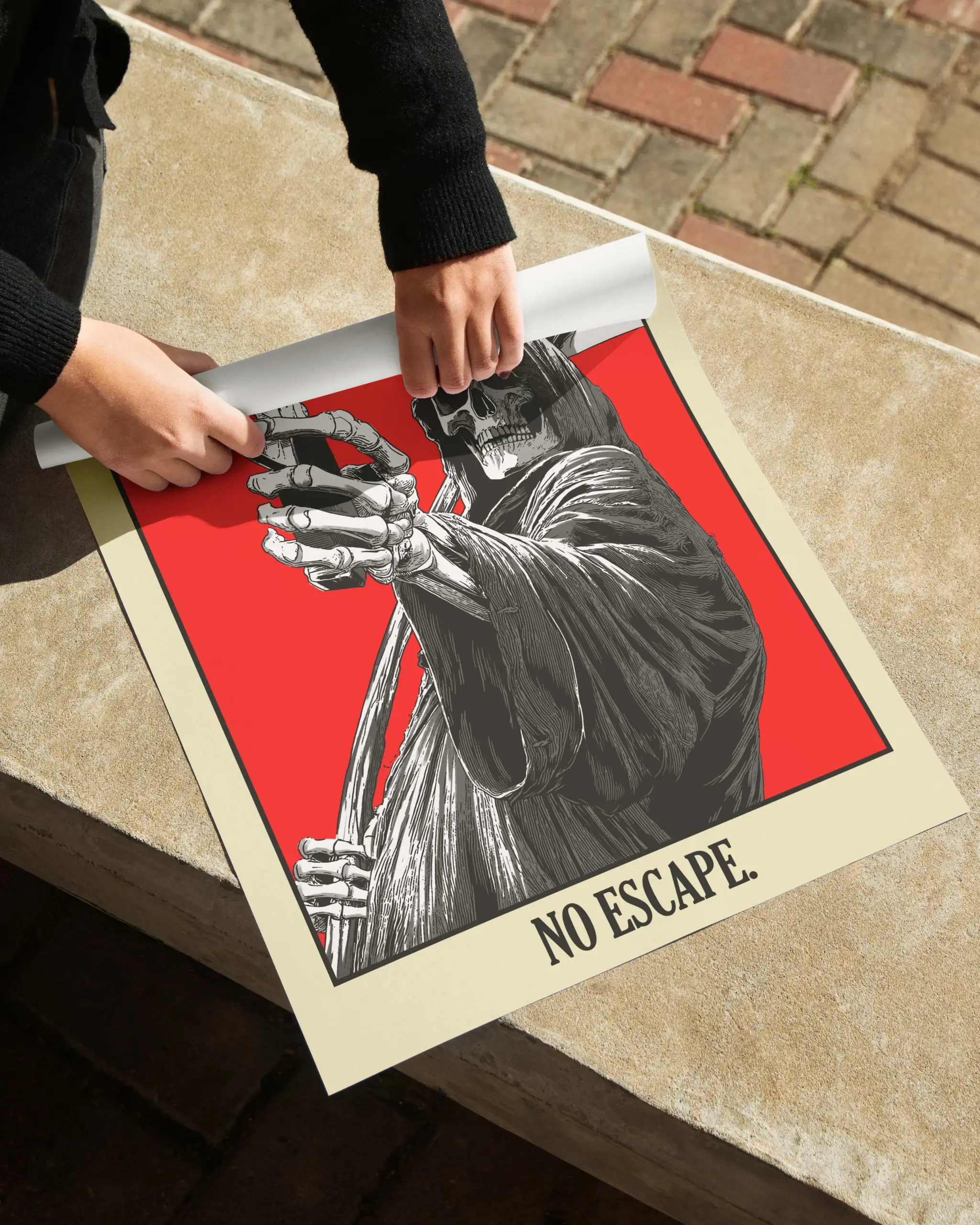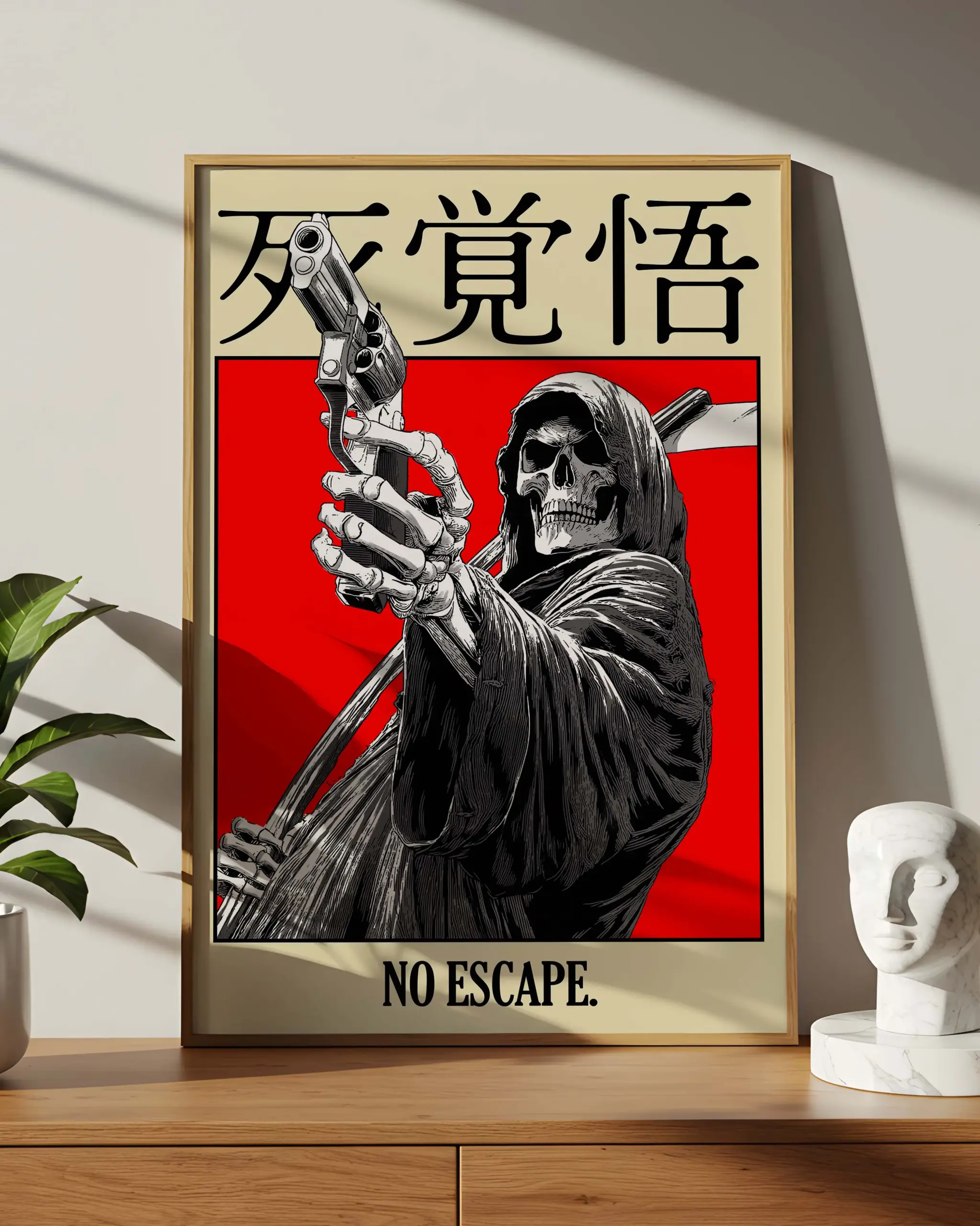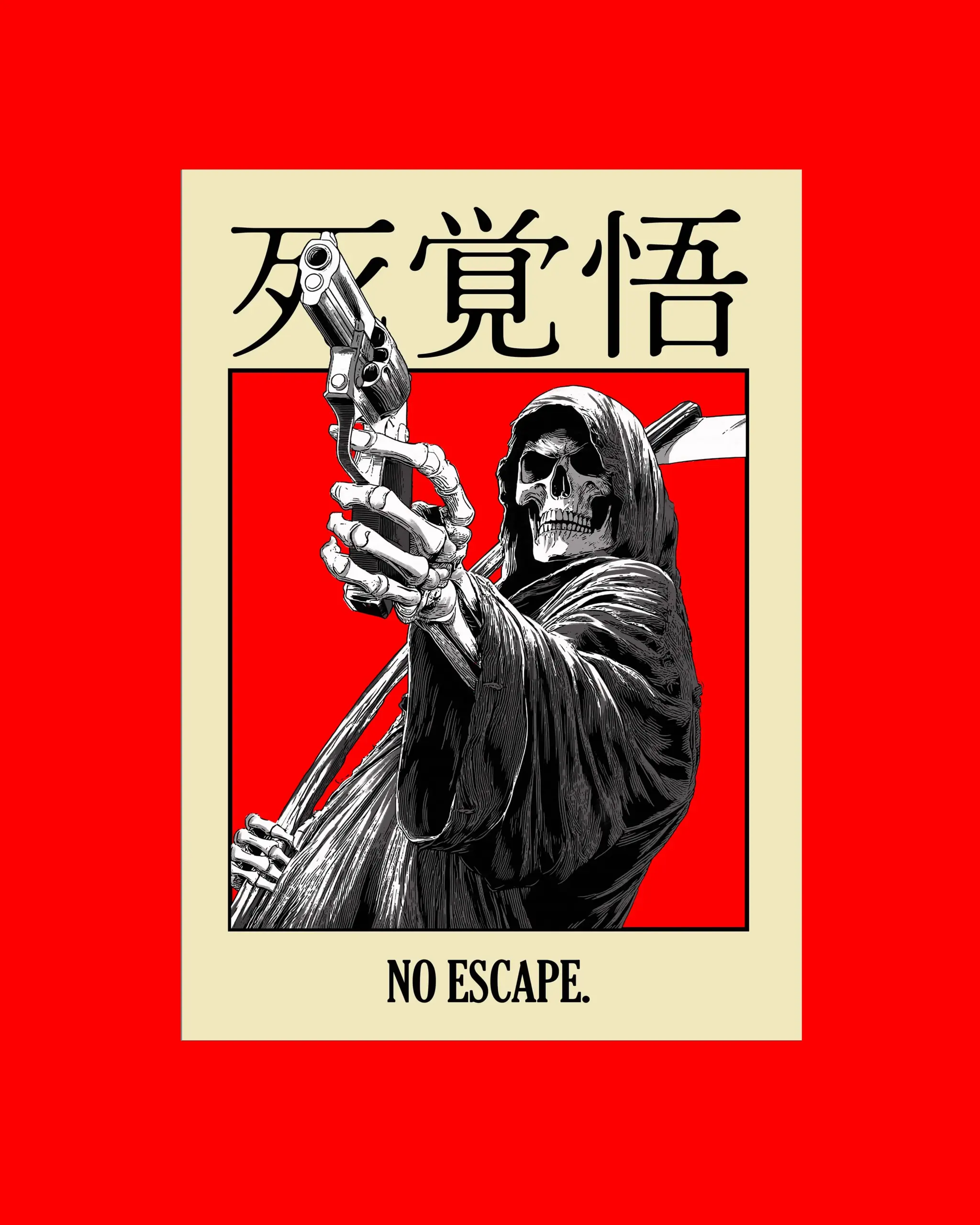 No Escape is a Japanese grim reaper poster inspired by dark Japanese art and death symbolism. The bold red background and detailed monochrome illustration create a powerful Japanese wall art print. Rooted in Japanese culture, this grim reaper artwork represents fate and inevitability, making it ideal for modern interiors, collectors of Japanese art, and fans of dark, gothic wall decor.