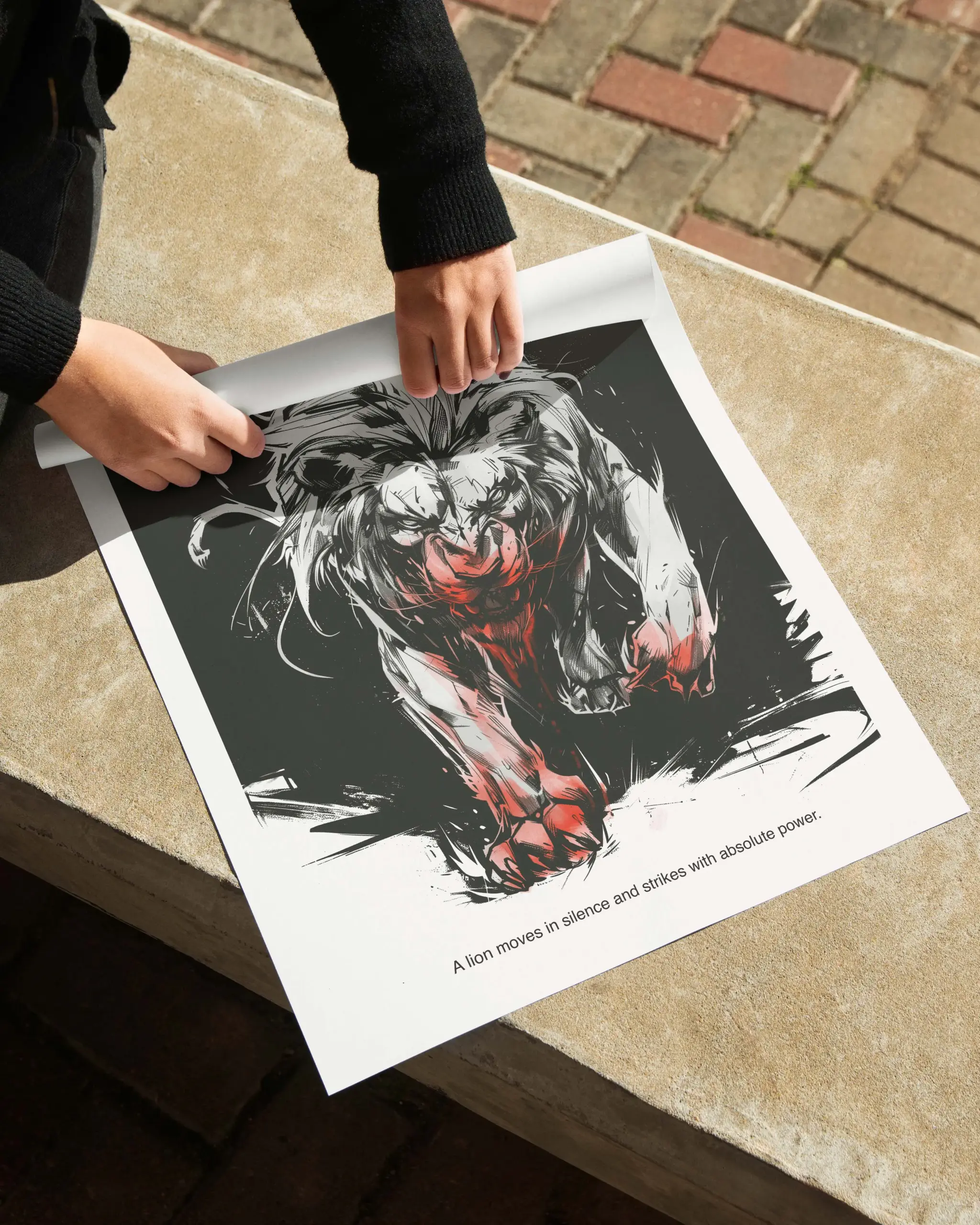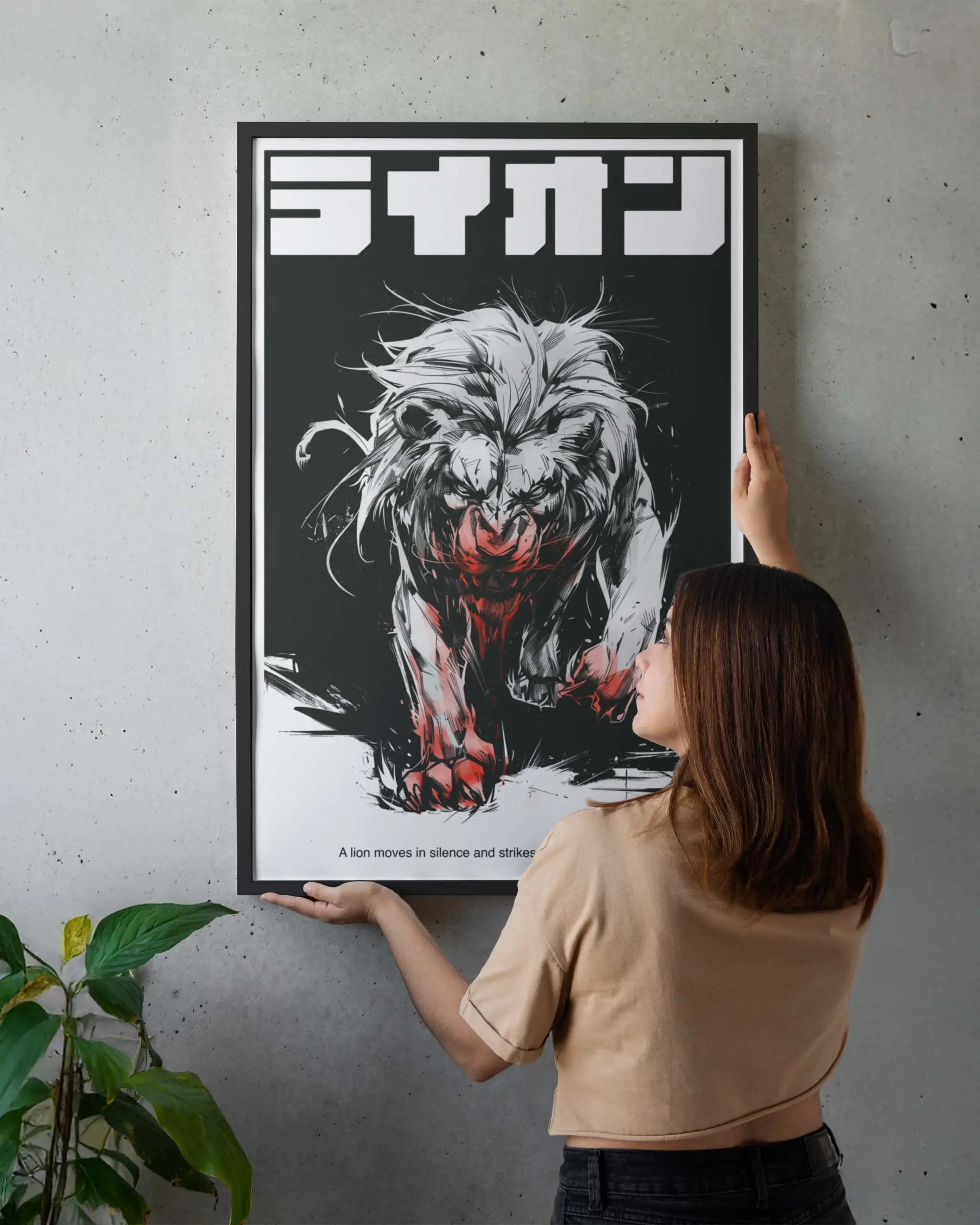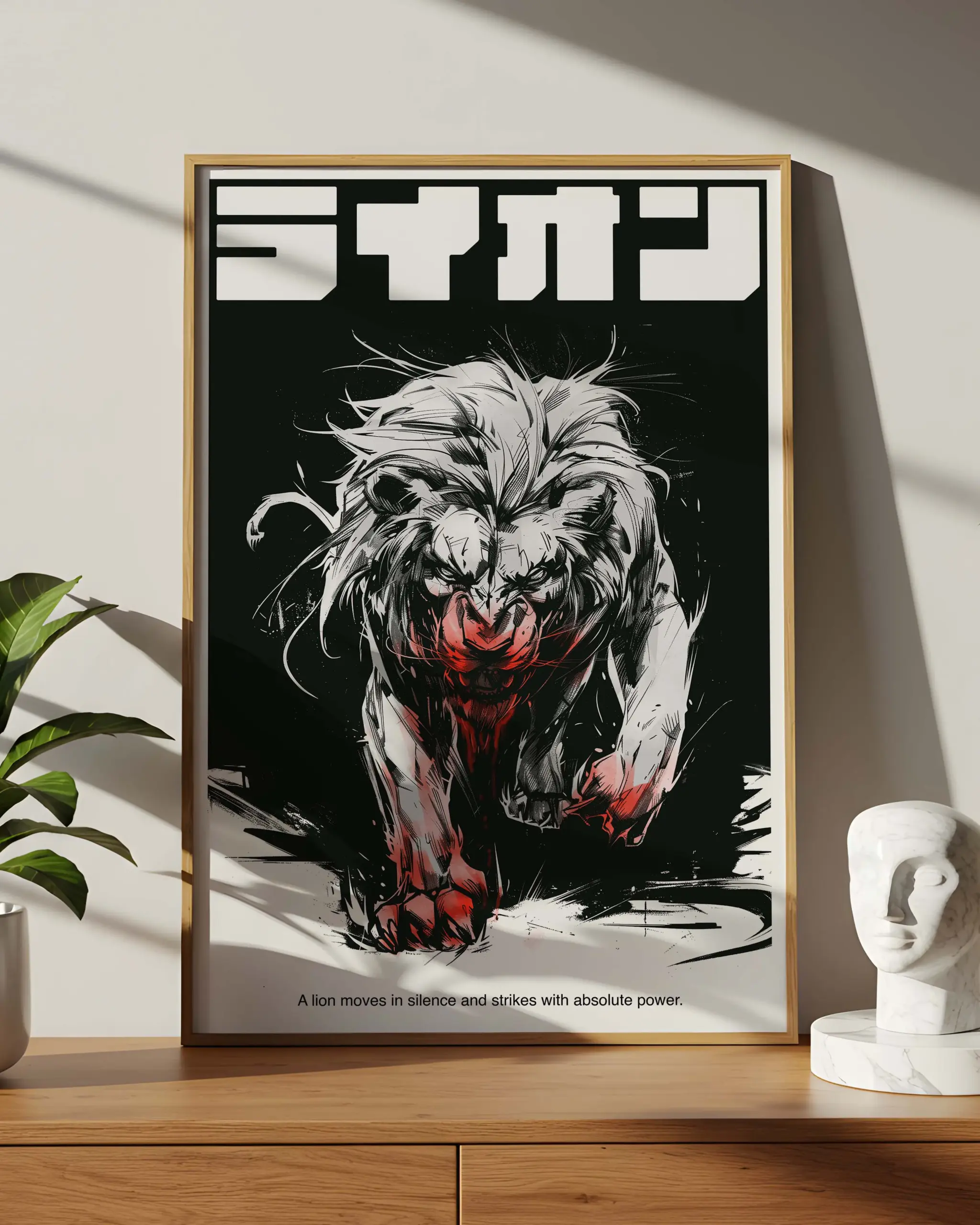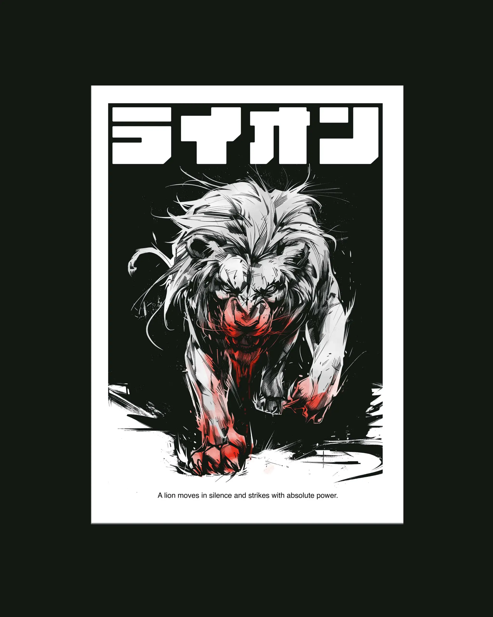 Powerful Japanese design lion poster rendered in bold black and white ink with dramatic red accents. This animal wall art captures motion and raw strength through expressive brush strokes and minimalist composition. Perfect as a lion poster or lion wall decor for rooms, offices. High quality art print available in A2 and multiple sizes ready to frame and ship worldwide.