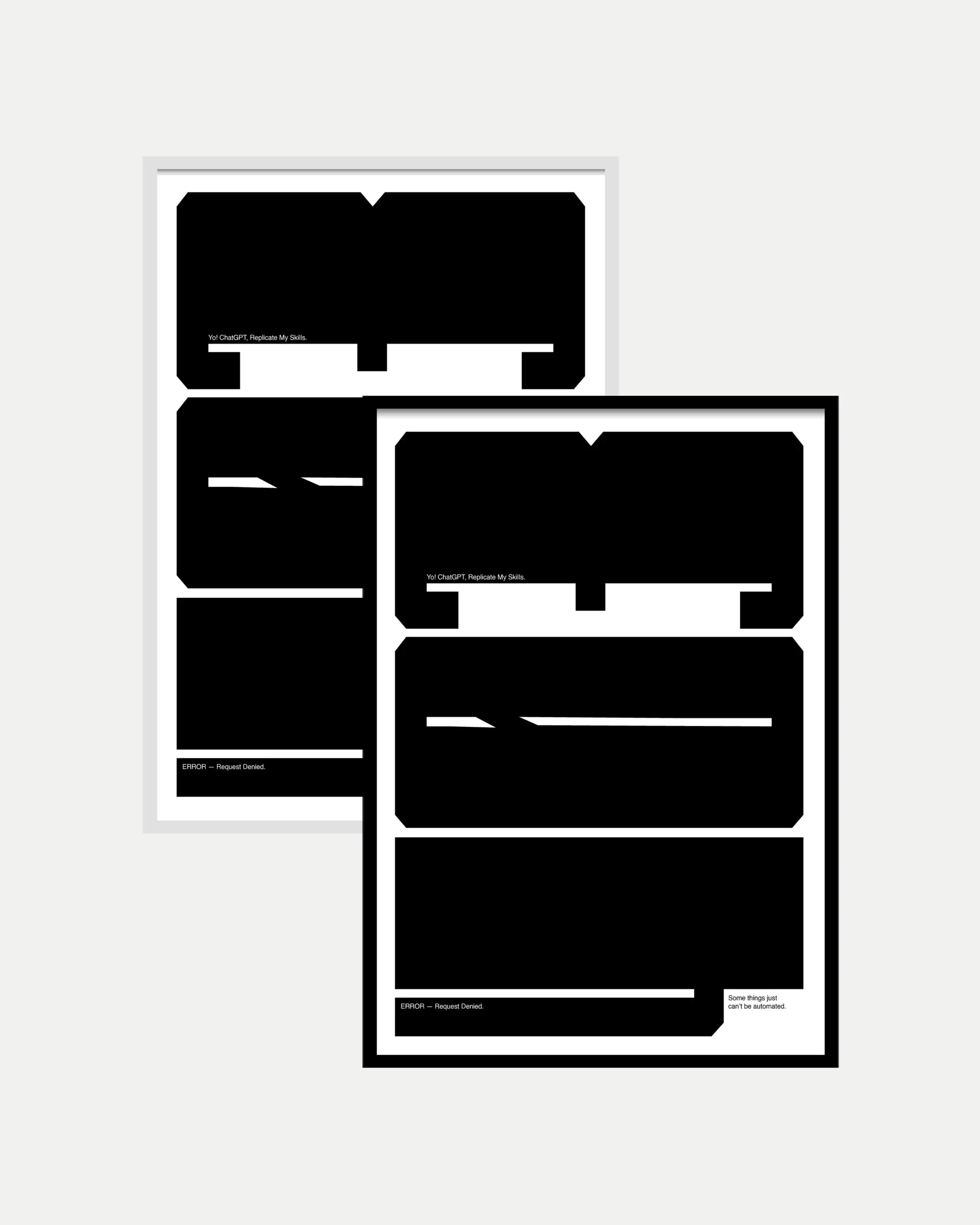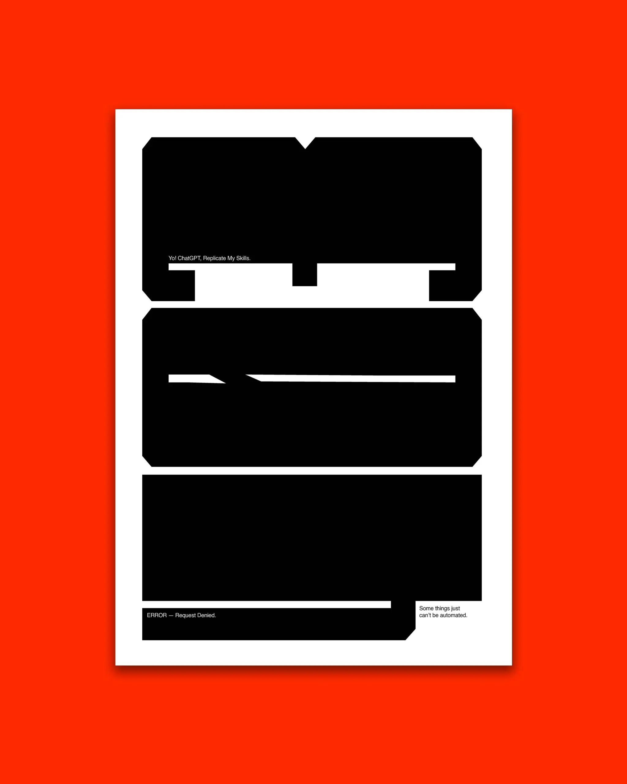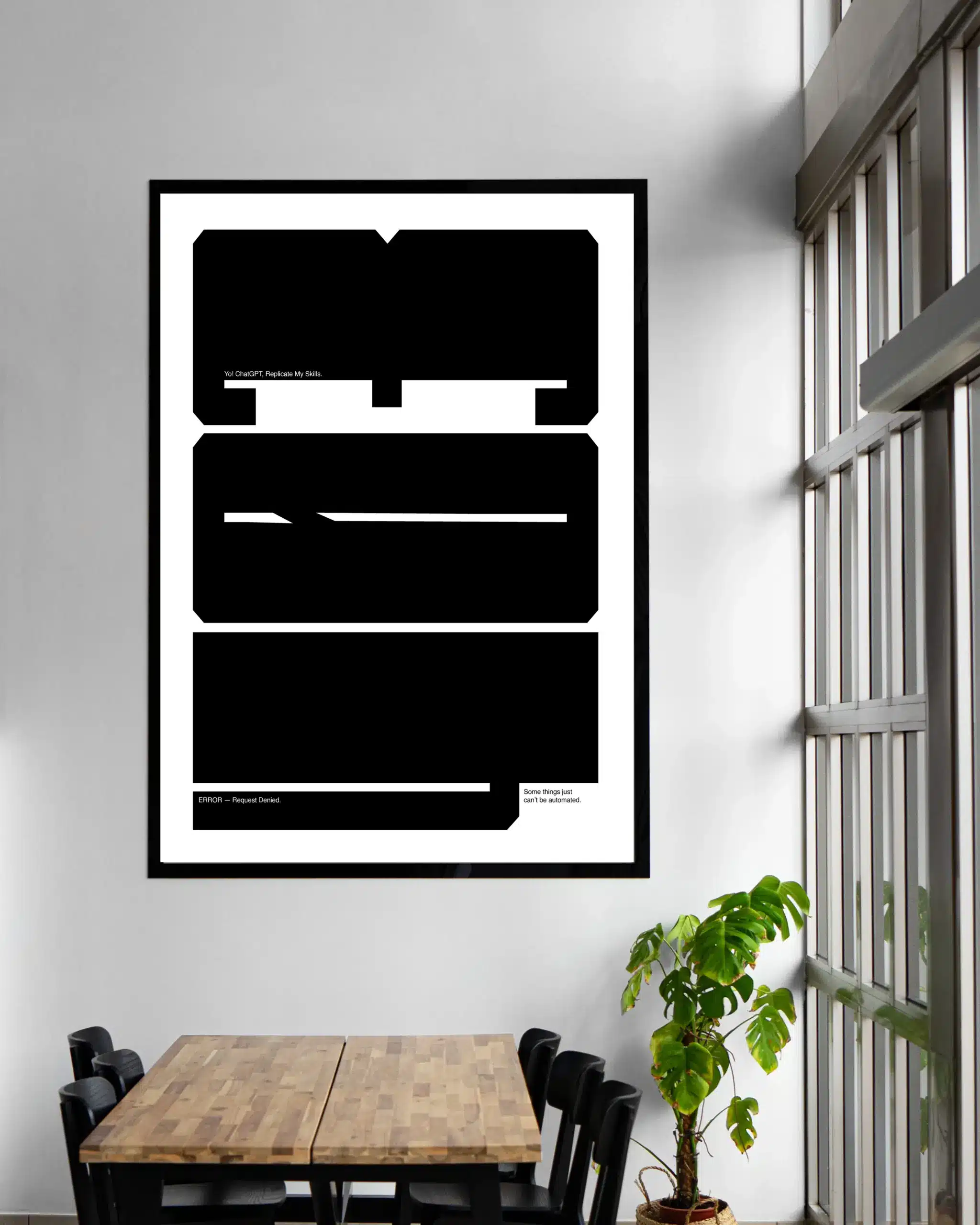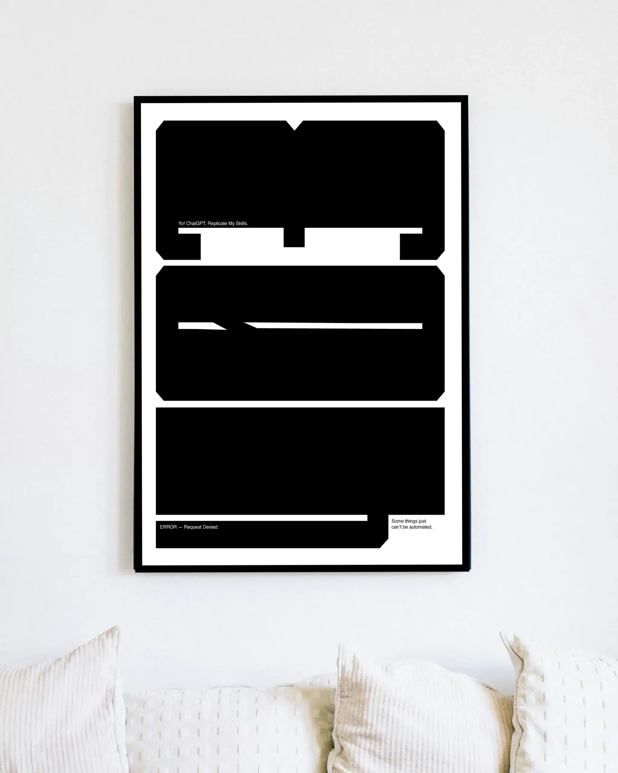 The poster’s clean design emphasizes the words “ERROR – Request Denied” and “Some things just can’t be automated,” making it a perfect addition to any office or creative space. It’s ideal for anyone who appreciates humor, technology, and the irreplaceable touch of real human work. Whether you’re a tech enthusiast or a creative, this piece speaks to those who value authenticity and ingenuity.