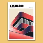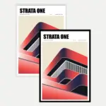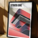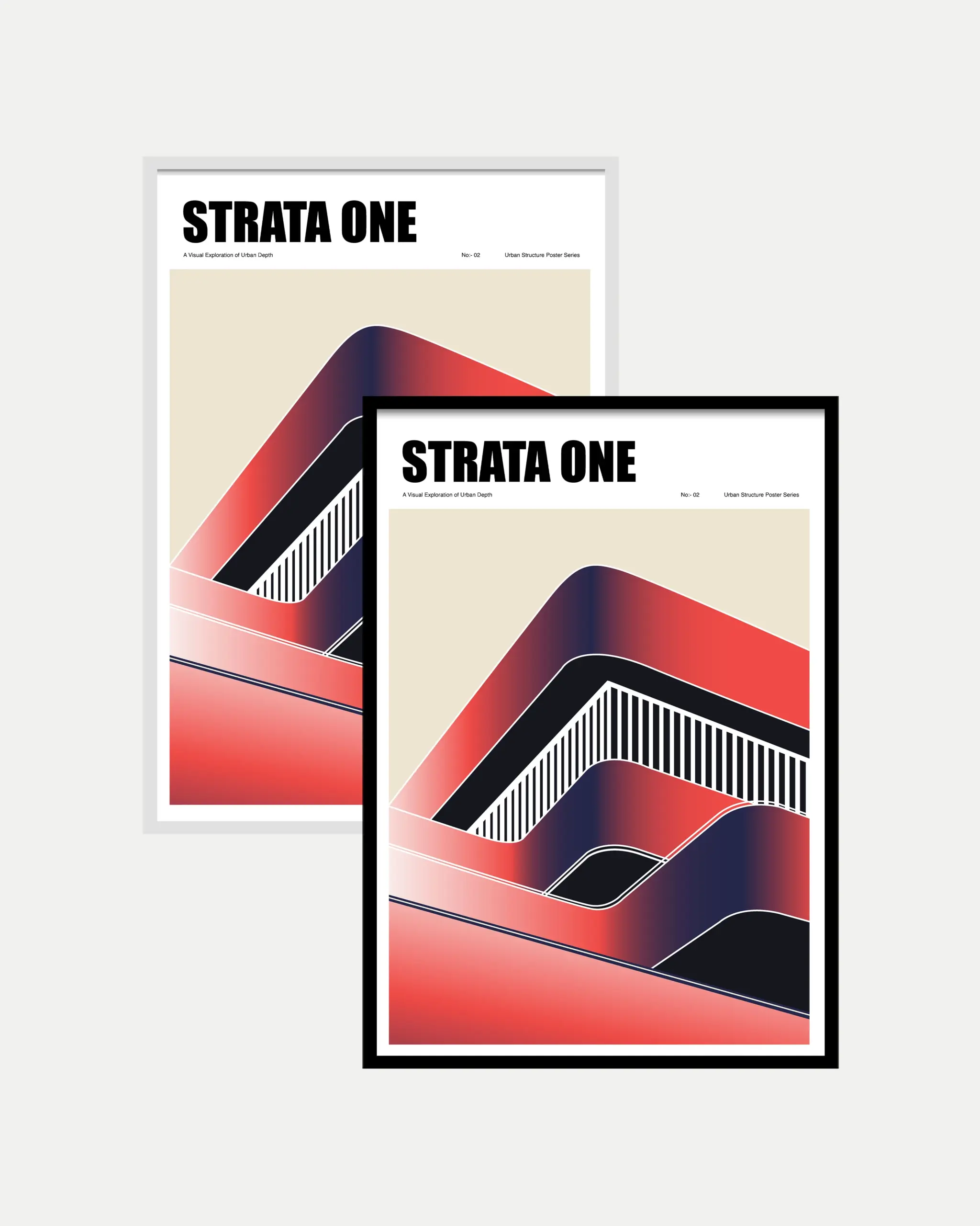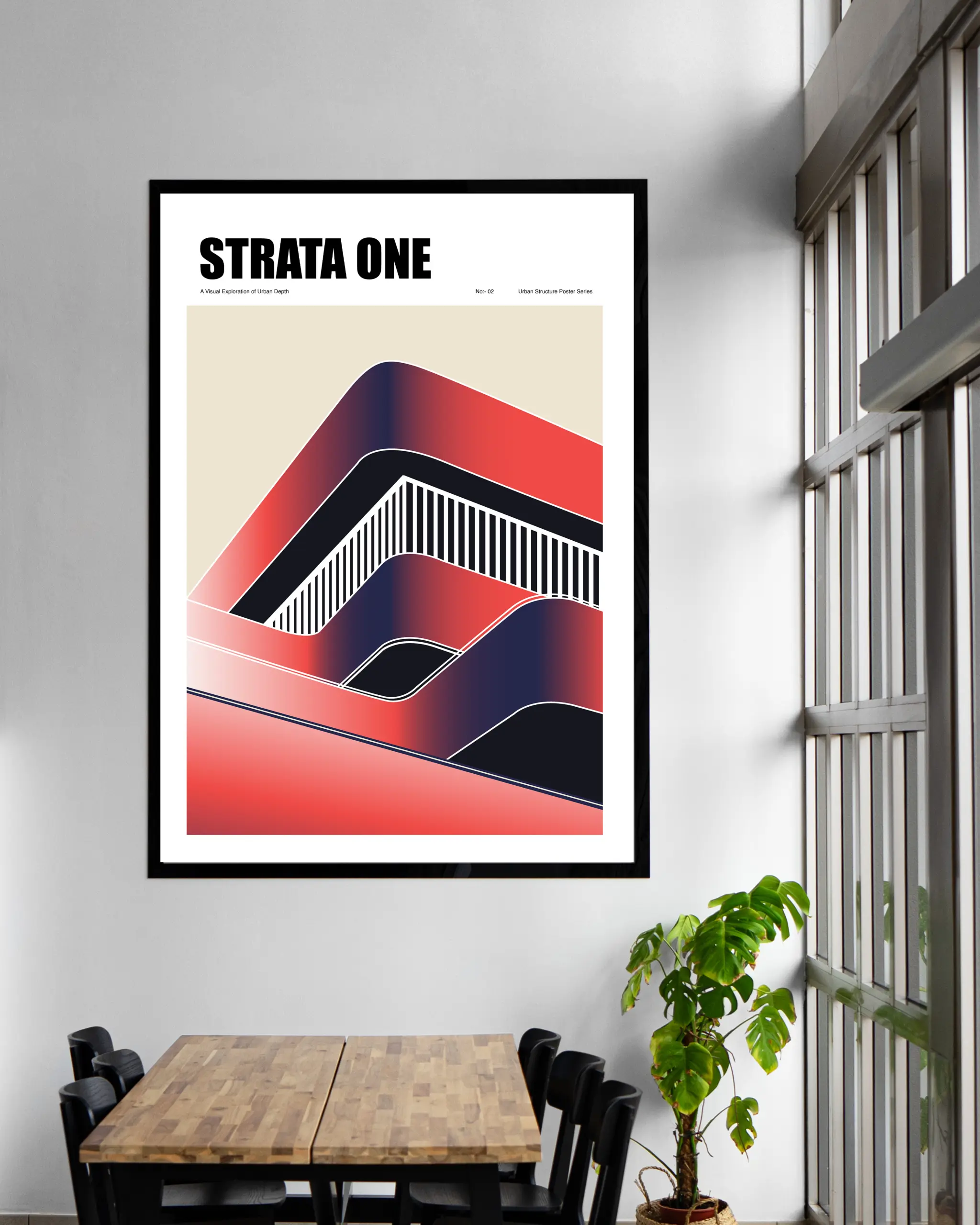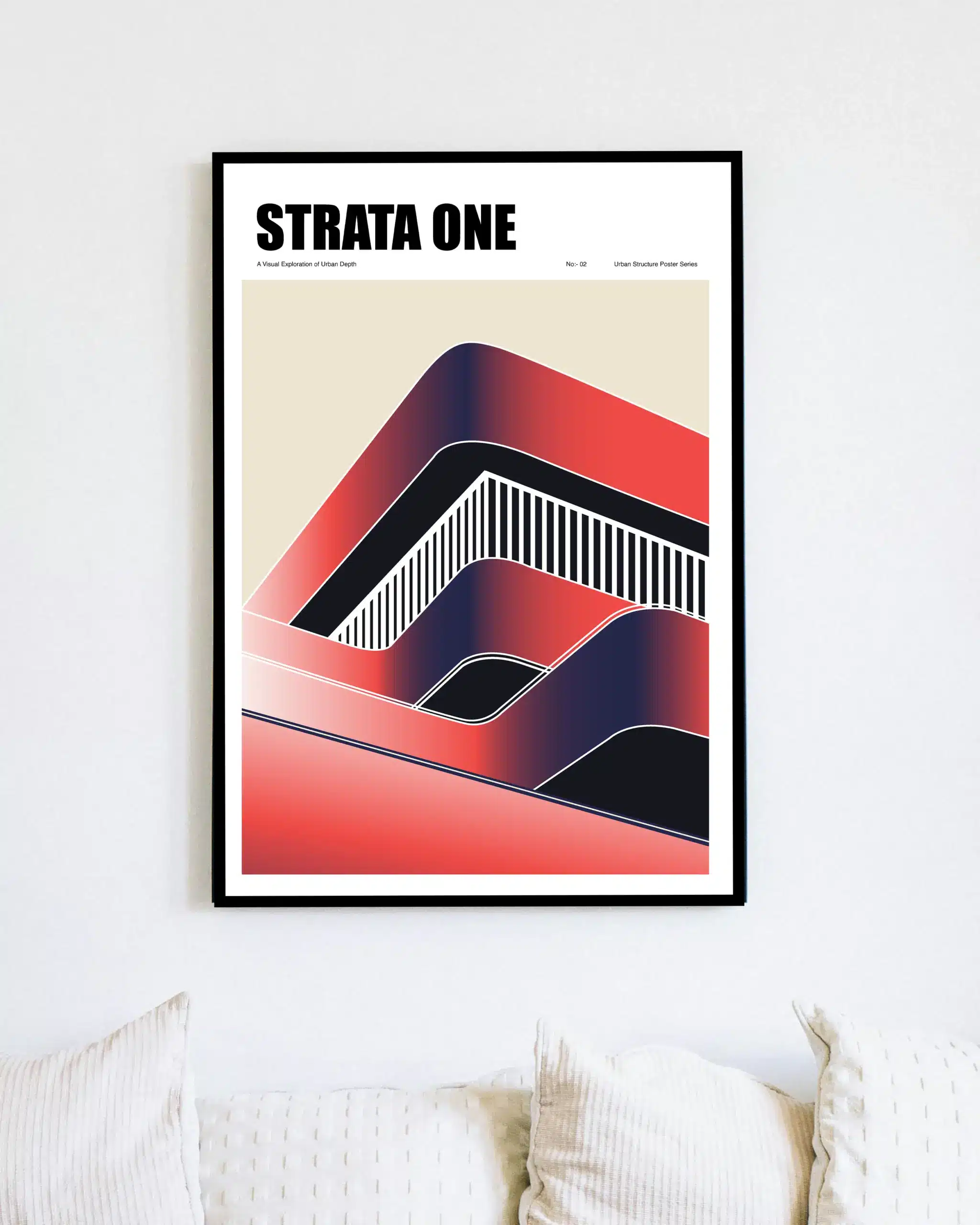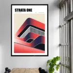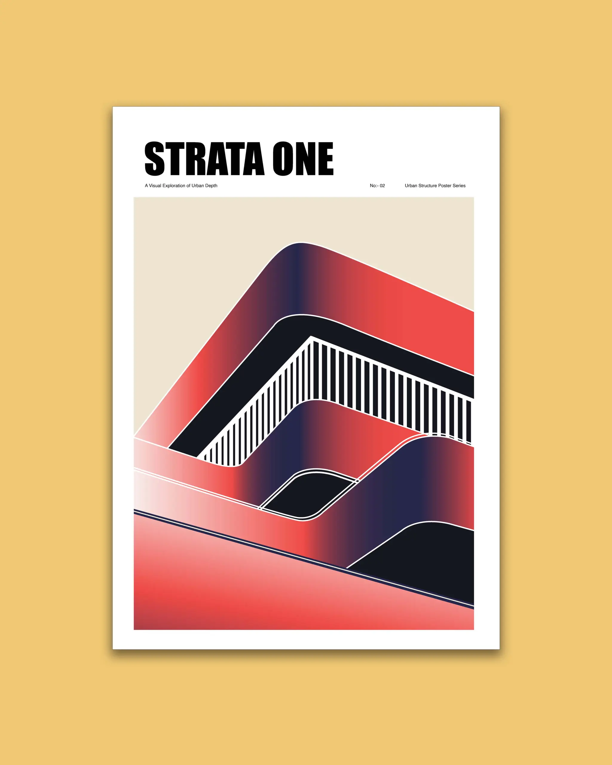 This “Inspired” urban structure poster highlights a modern architectural vision shaped by bold layers and flowing lines. Soft gradients of red and deep navy create a sense of depth, while curved forms suggest movement and a sense of balance. Vertical stripes cut through the design, echoing the rhythm of urban facades and structural grids.