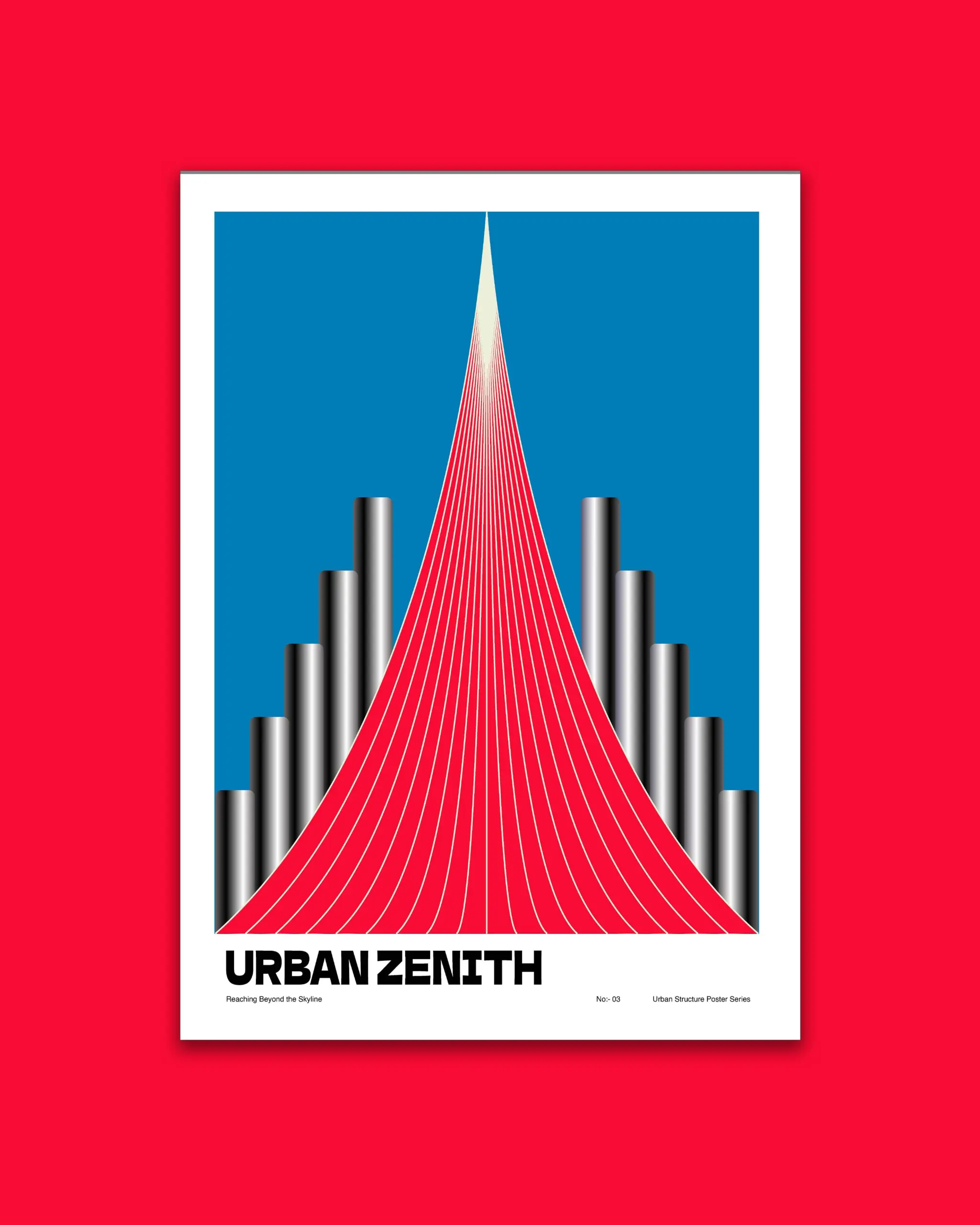 The poster features a bold urban-inspired design. Red lines rise sharply and meet at a single peak, symbolizing growth and ambition. On both sides, black cylindrical structures stand tall, adding depth and rhythm to the scene.