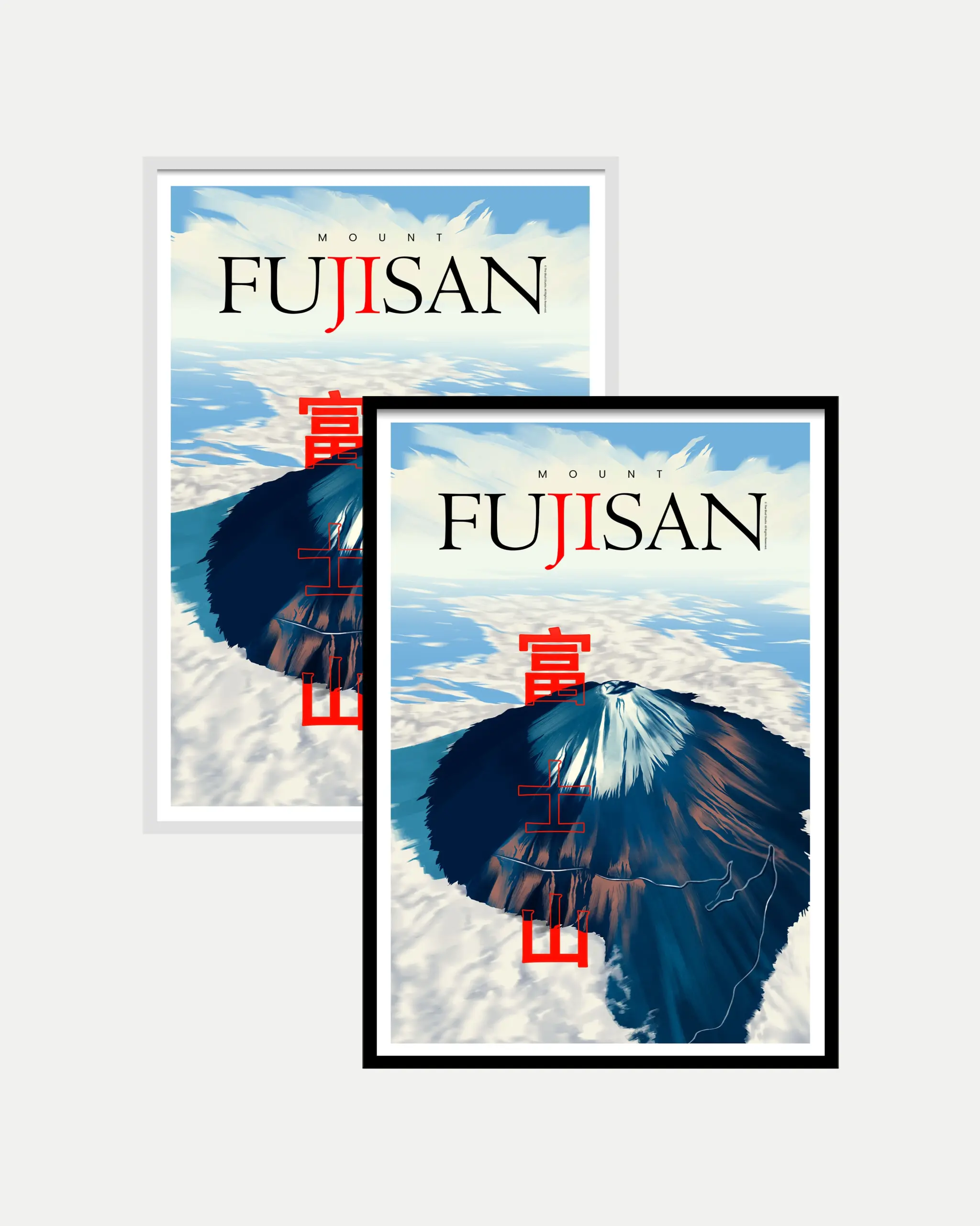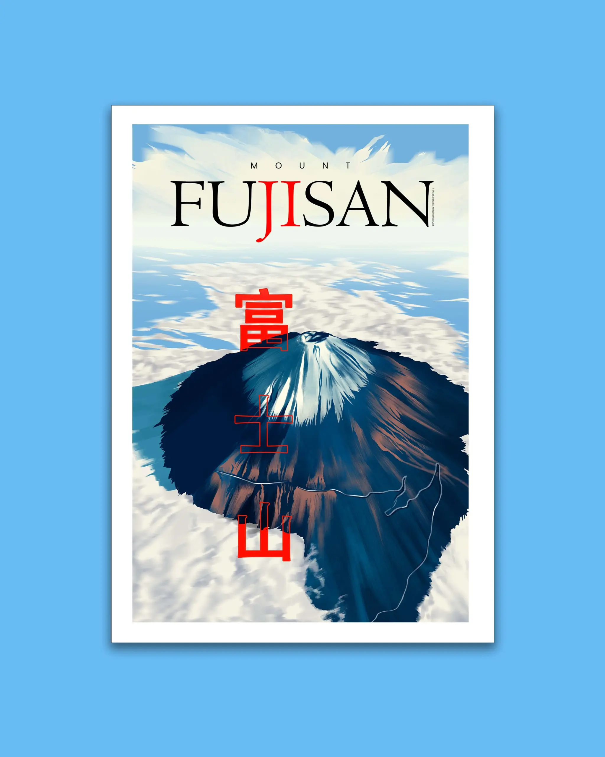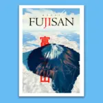 The poster beautifully captures a breathtaking top-angle view of Mount Fujisan, Japan’s most iconic peak. Snow crowns the summit while deep shadows and warm highlights sweep across its slopes, creating a sense of depth and natural grandeur. Surrounding clouds form a soft sea beneath the mountain, giving the artwork a dreamlike atmosphere.