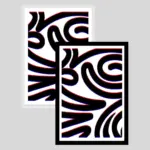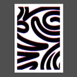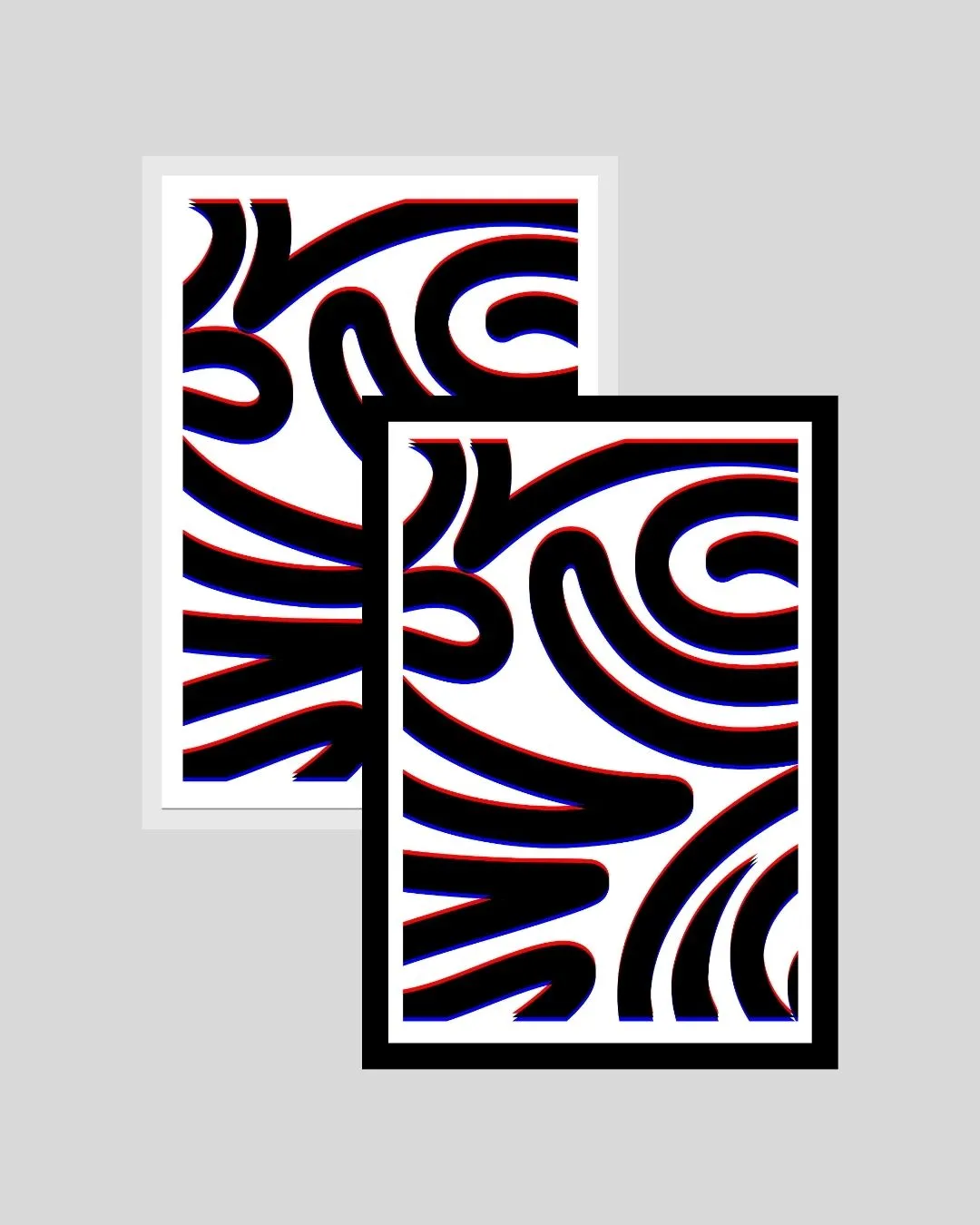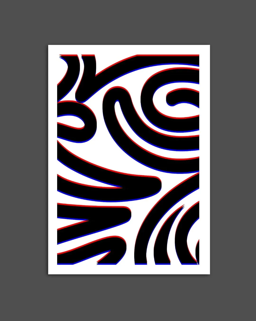 This poster features a bold abstract design titled “Curves,” showcasing sweeping black strokes that flow across a clean white background. The shapes are enhanced with a chromatic aberration effect, outlined in red and blue, giving the artwork a striking 3D illusion and digital edge.
