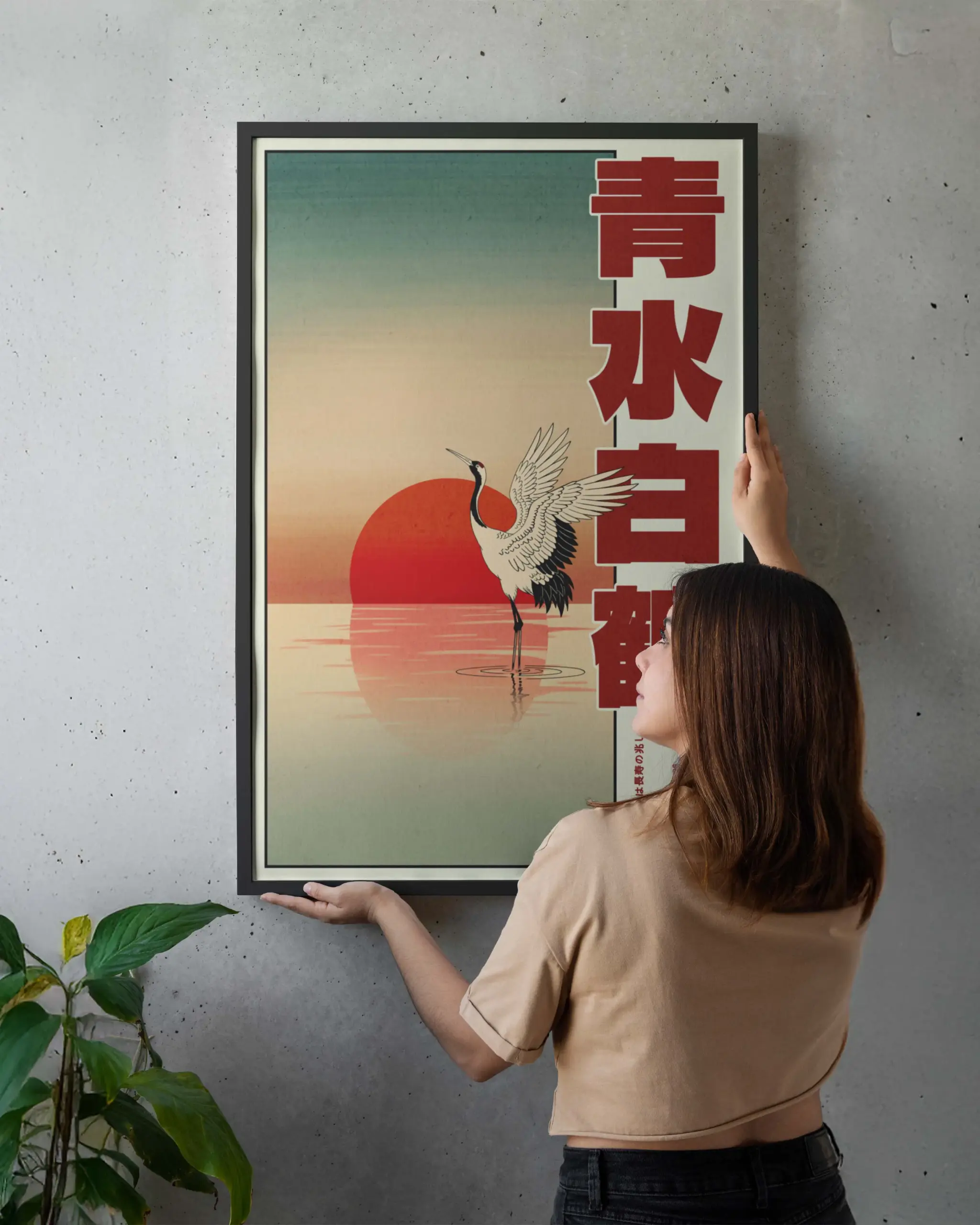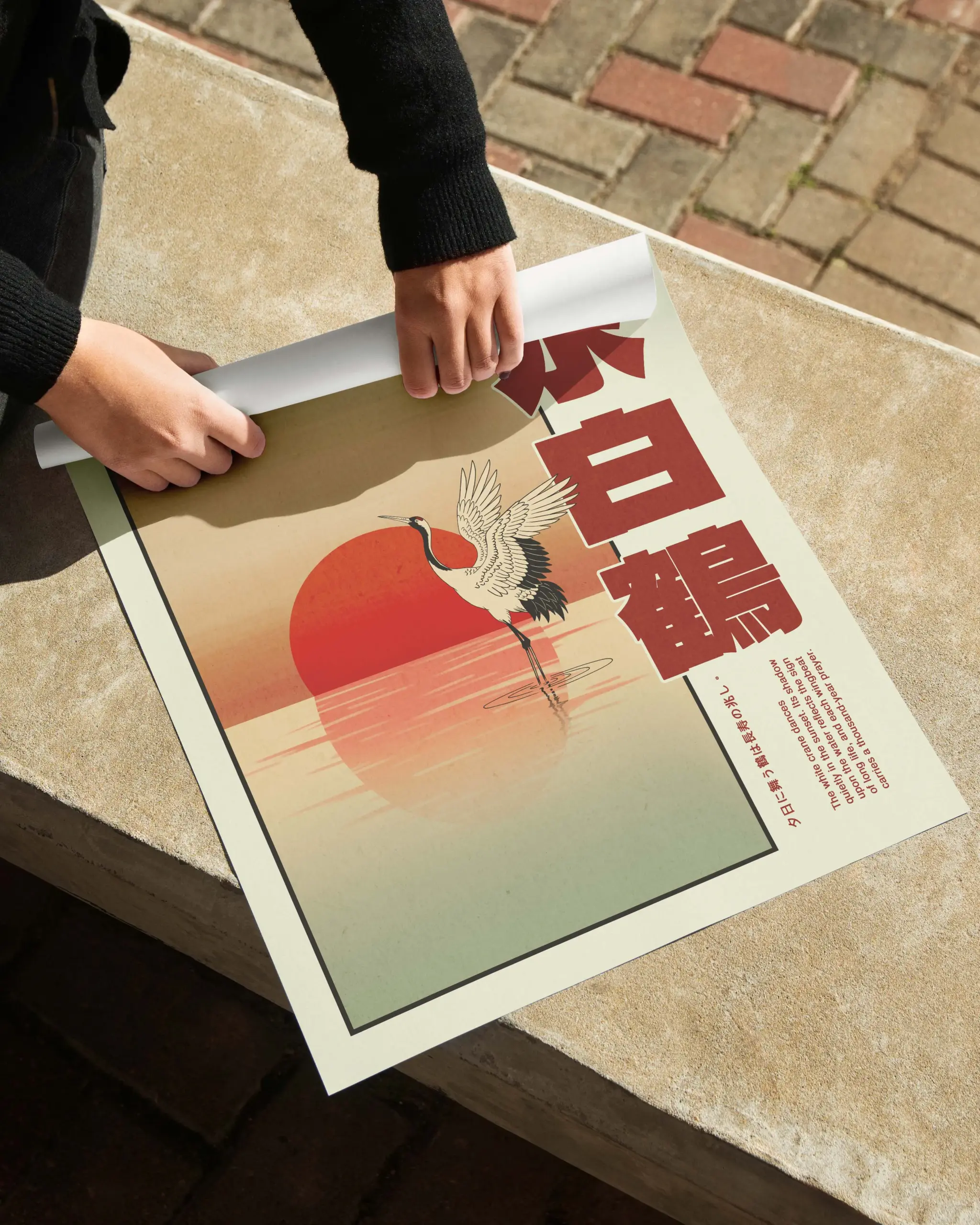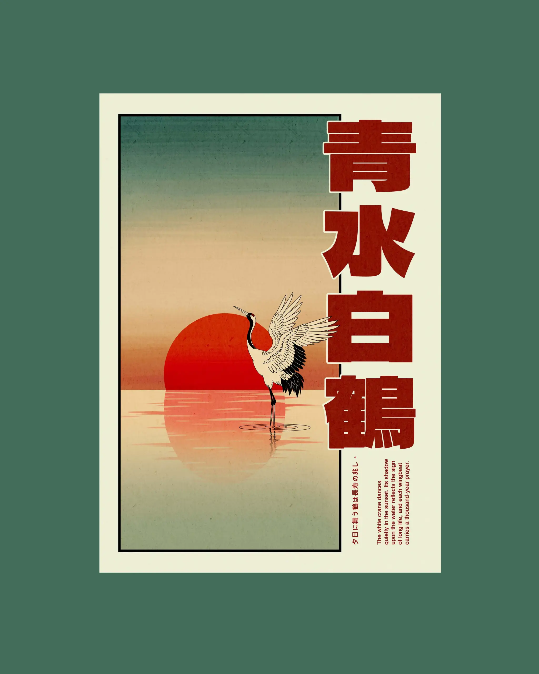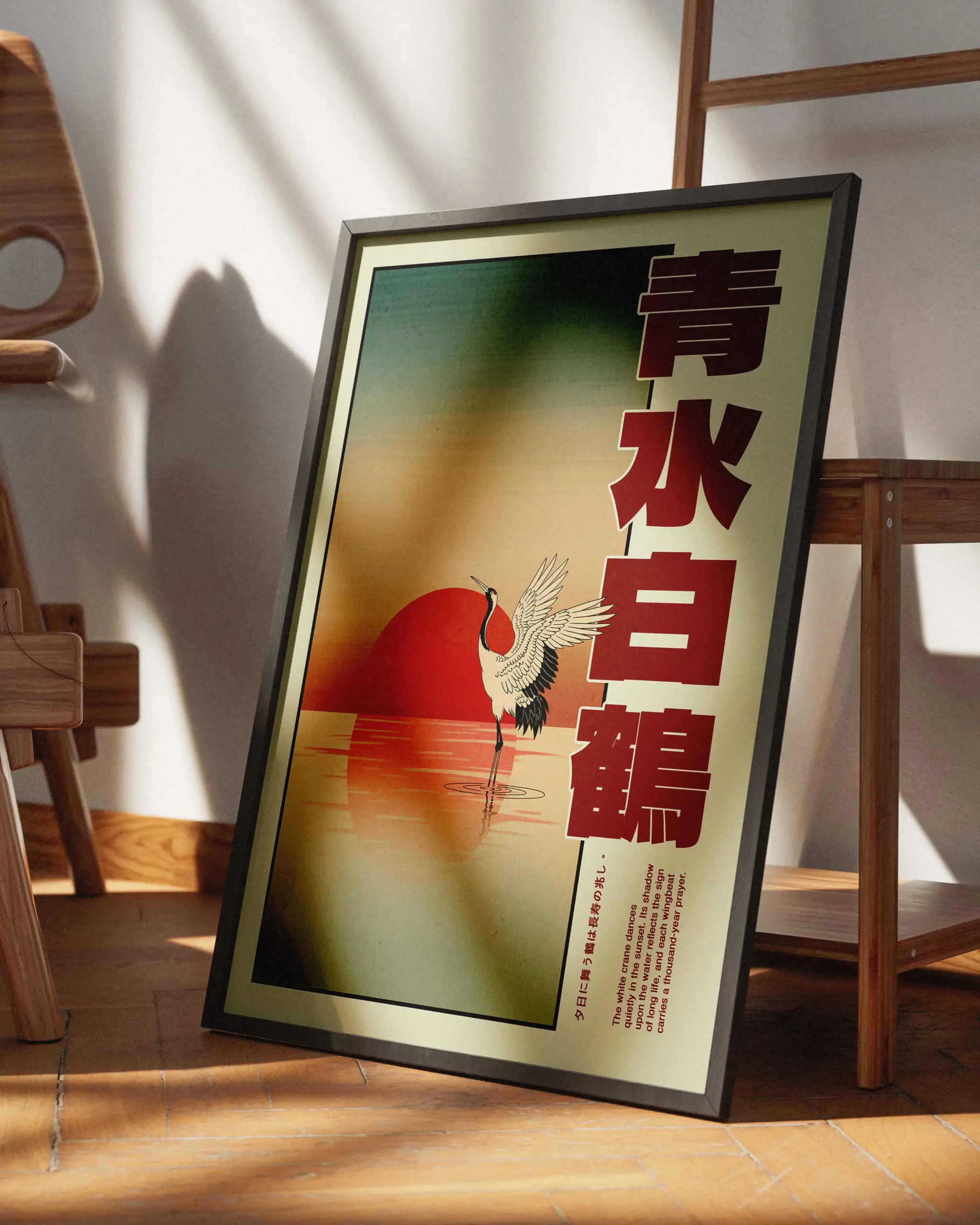 This poster features a graceful crane standing in calm water against a striking red sun at sunset. The soft gradient sky blends warm and cool tones, creating a serene atmosphere. Bold Japanese characters add cultural depth, while the minimalist composition and delicate linework give the artwork a refined, elegant, and timeless aesthetic.